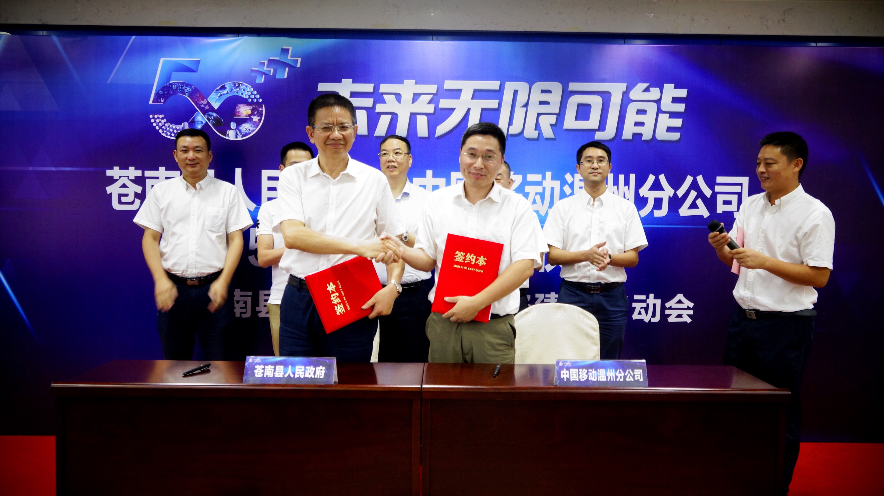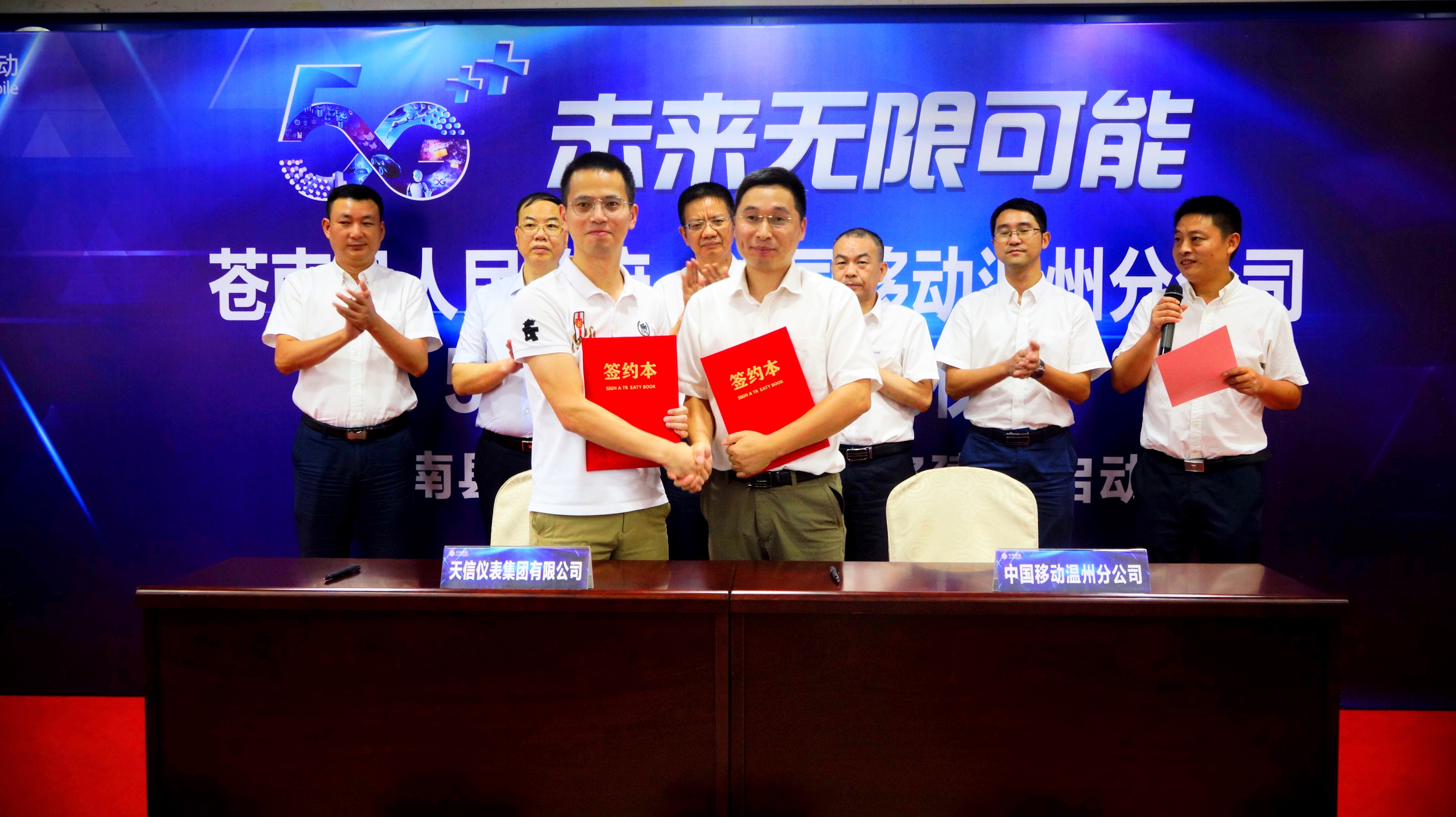 9月12日,在蒼南移動大樓舉行了蒼南縣人民政府與中國移動溫州分公司5G戰略協議簽訂儀式暨蒼南縣首批5G企業網絡建設啟動會。蒼南縣副縣長李上清、中國移動溫州分公司總經理助理葉朝陽、天信儀表集團有限公司副總裁李孝評等單位領導參加了簽約儀式。